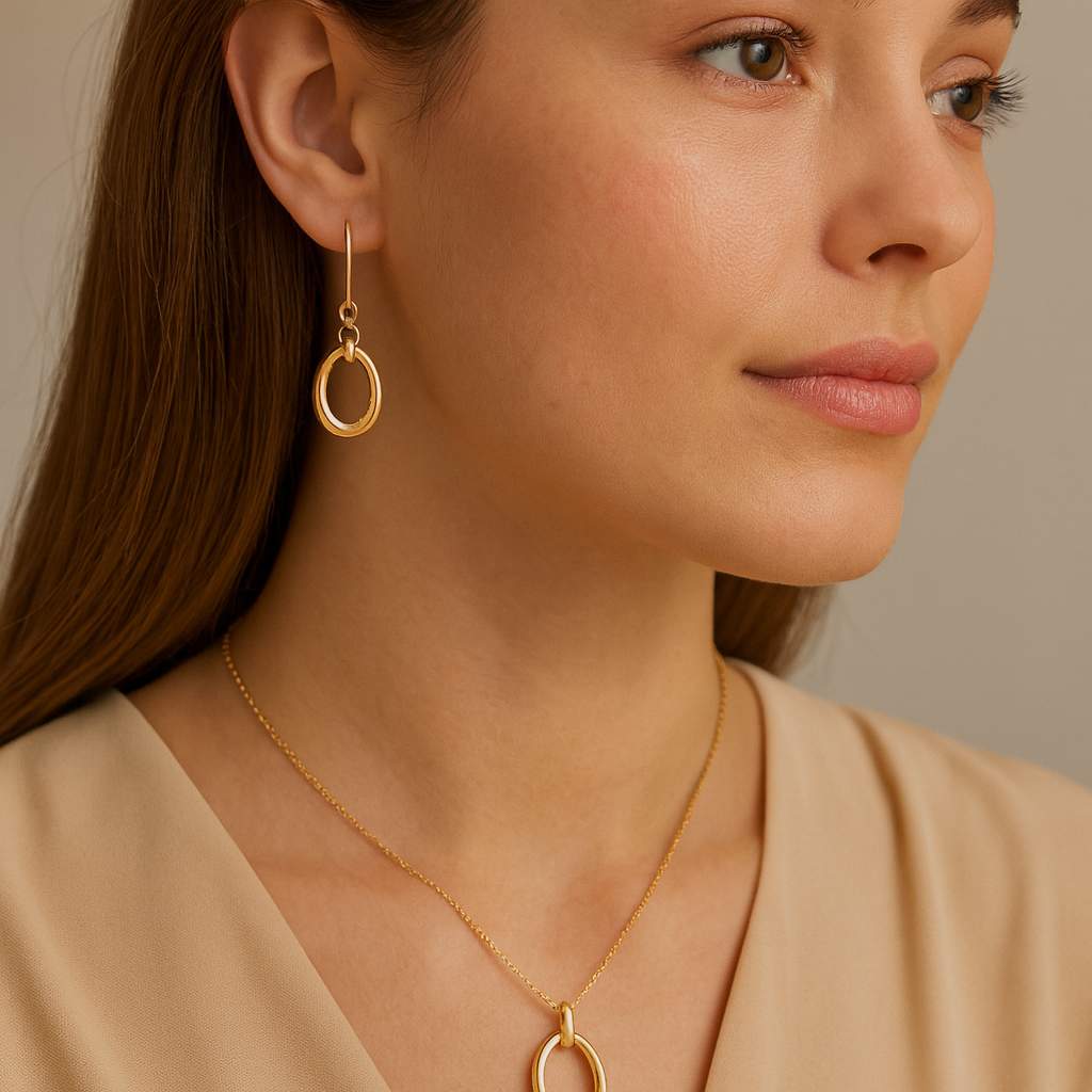 Ce pendentif raffiné est réalisé en argent sterling 925, finement plaqué d’or 14k pour un éclat radieux et intemporel. Son design minimaliste en ovale ouvert offre une silhouette moderne et délicate qui s’adapte à tous les styles. Suspendu à une fine chaîne, il se porte avec grâce seul ou accompagné des boucles d’oreilles assorties pour une parure complète.
