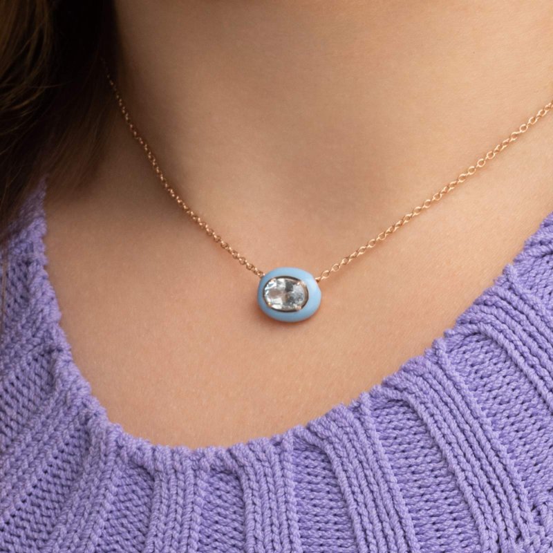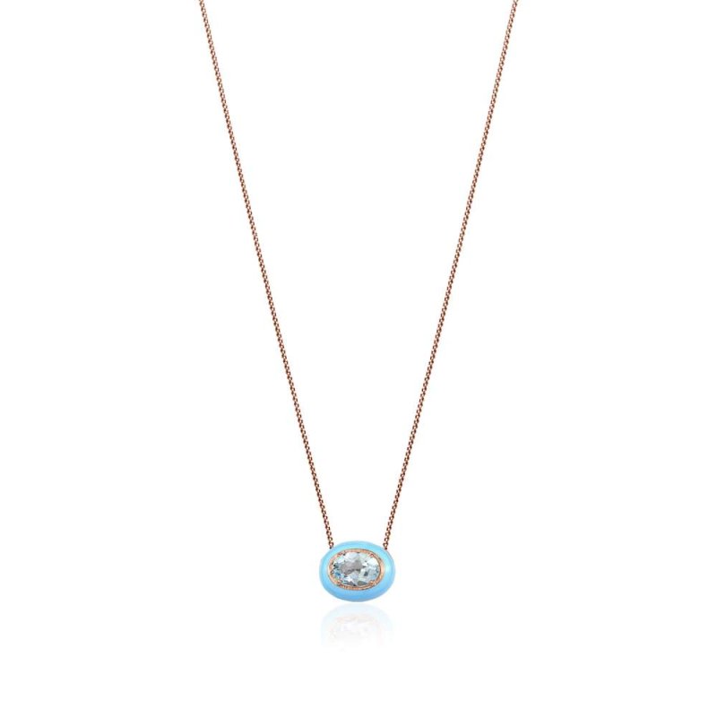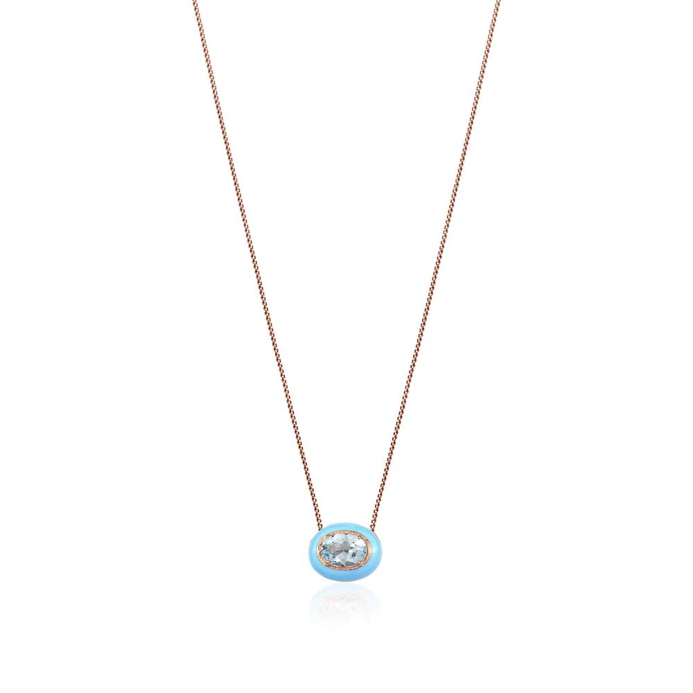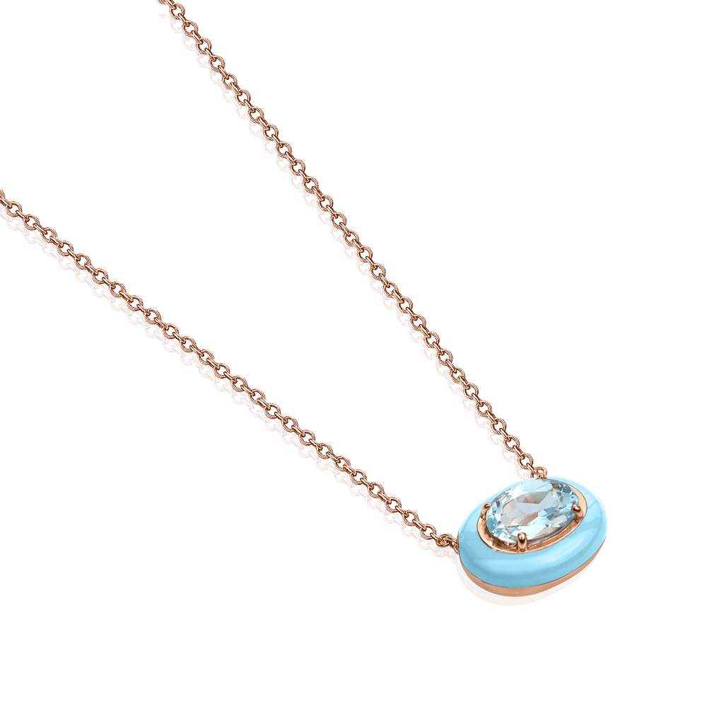 Ce pendentif raffiné présente un halo ovale d’émail bleu ciel entourant une topaze bleue éclatante. Le contraste entre la douceur du bleu pastel et l’éclat cristallin de la pierre crée une esthétique fraîche et élégante. La finition or rose apporte une chaleur subtile à l’ensemble.