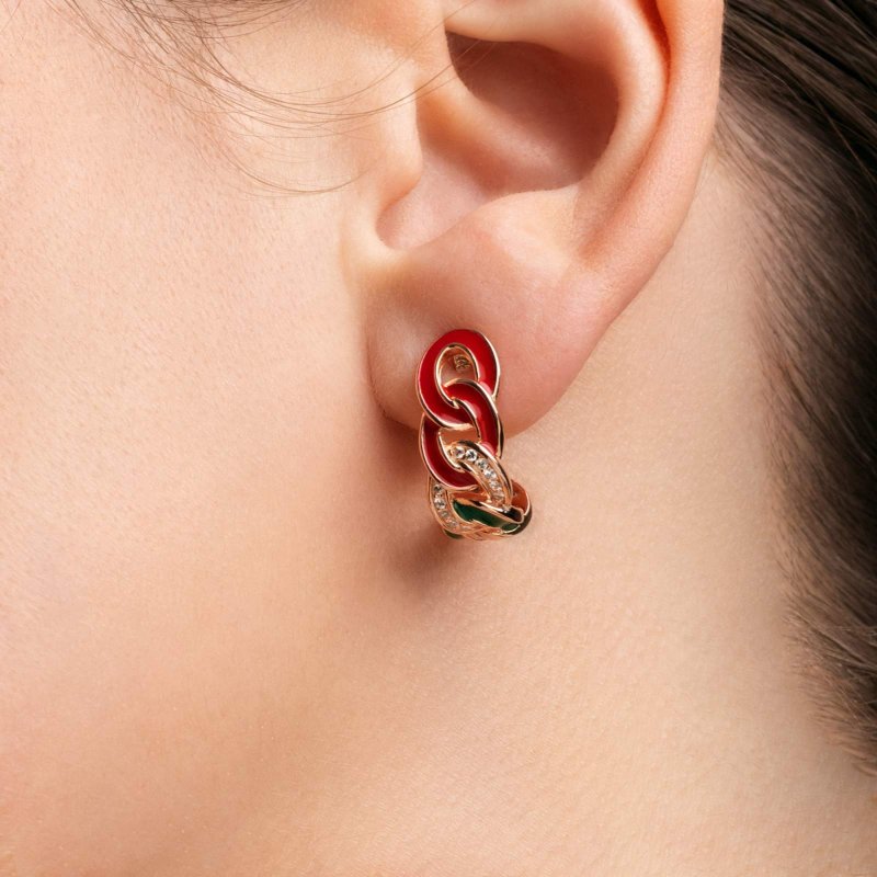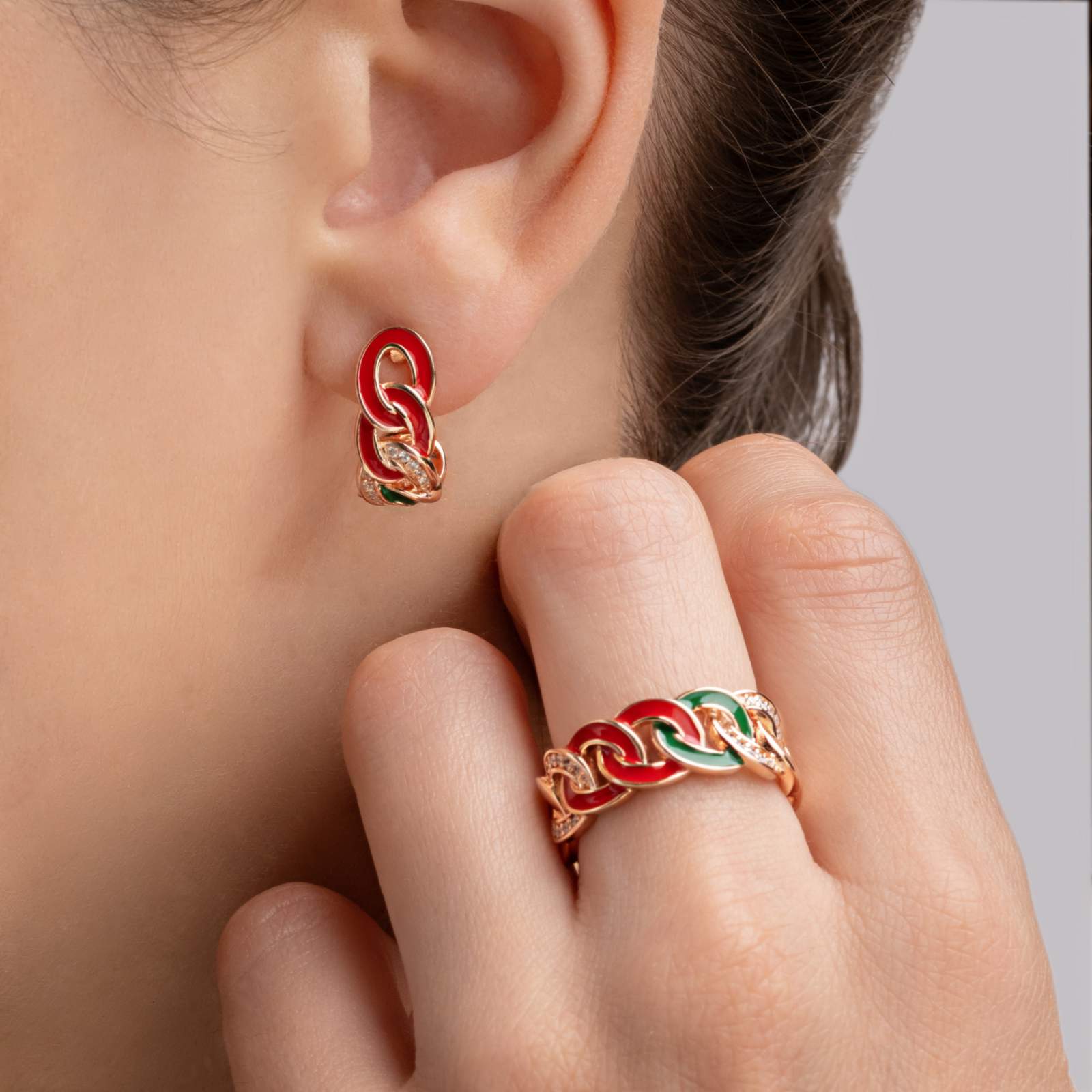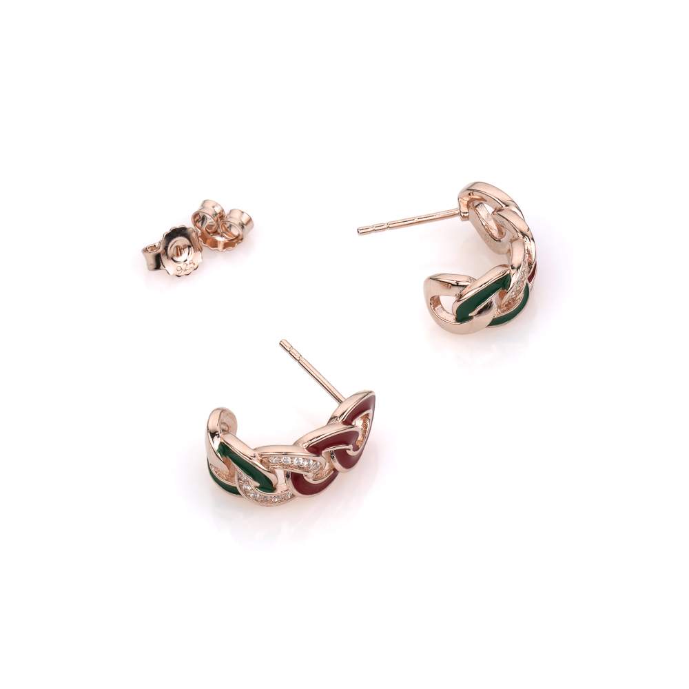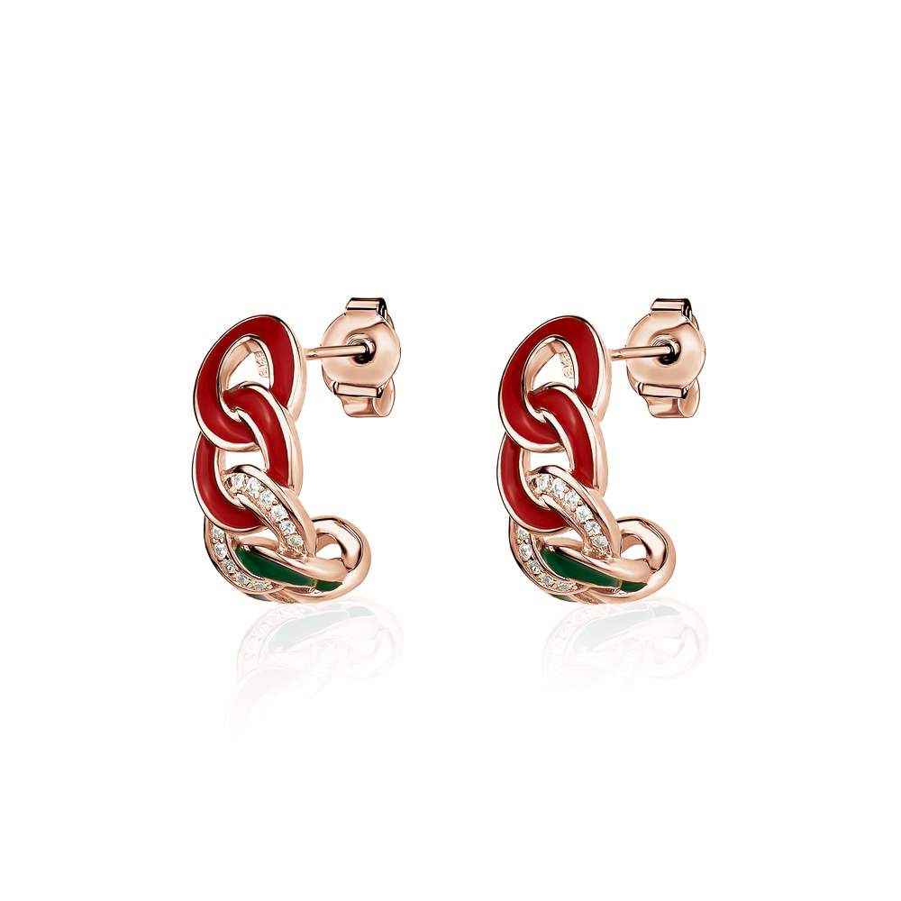 Les boucles d’oreilles Granada réinventent la créole demi-anneau avec une esthétique vibrante et sophistiquée. Conçues en argent sterling plaqué or rose 14K, elles marient des maillons émaillés rouge et vert à un pavé étincelant. Un design sculptural qui capte la lumière et rehausse instantanément votre style.