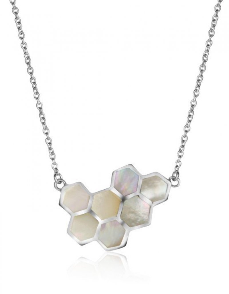 Collier nid d'abeille avec nacre de perle blanc sur argent plaqué rhodium.