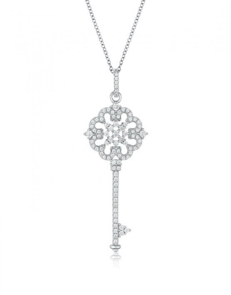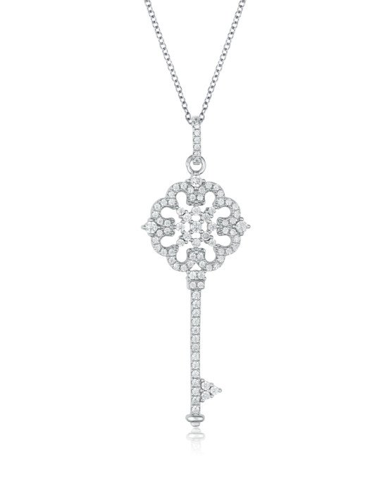 Pendentif en forme de clé plaqué rhodium avec zircons cubiques micro pavés.