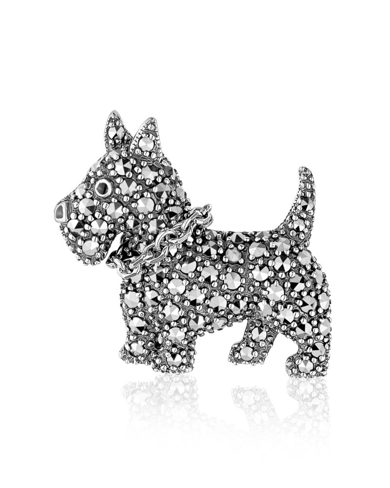 Broche en forme de chien en argent oxydé avec collier chaine en argent et marcassites serties.