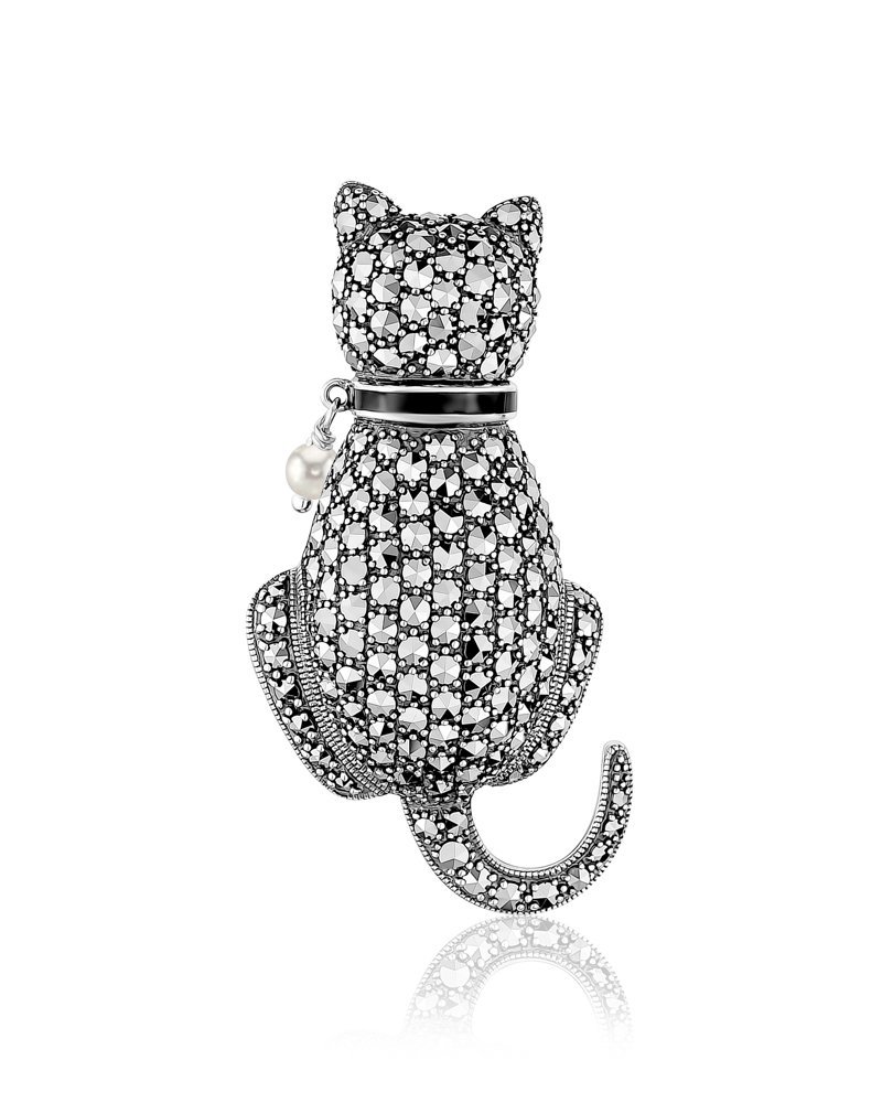 Broche chaton en argent oxydée avec collier d'émail noir, perle d'eau douce et marcassites serties.