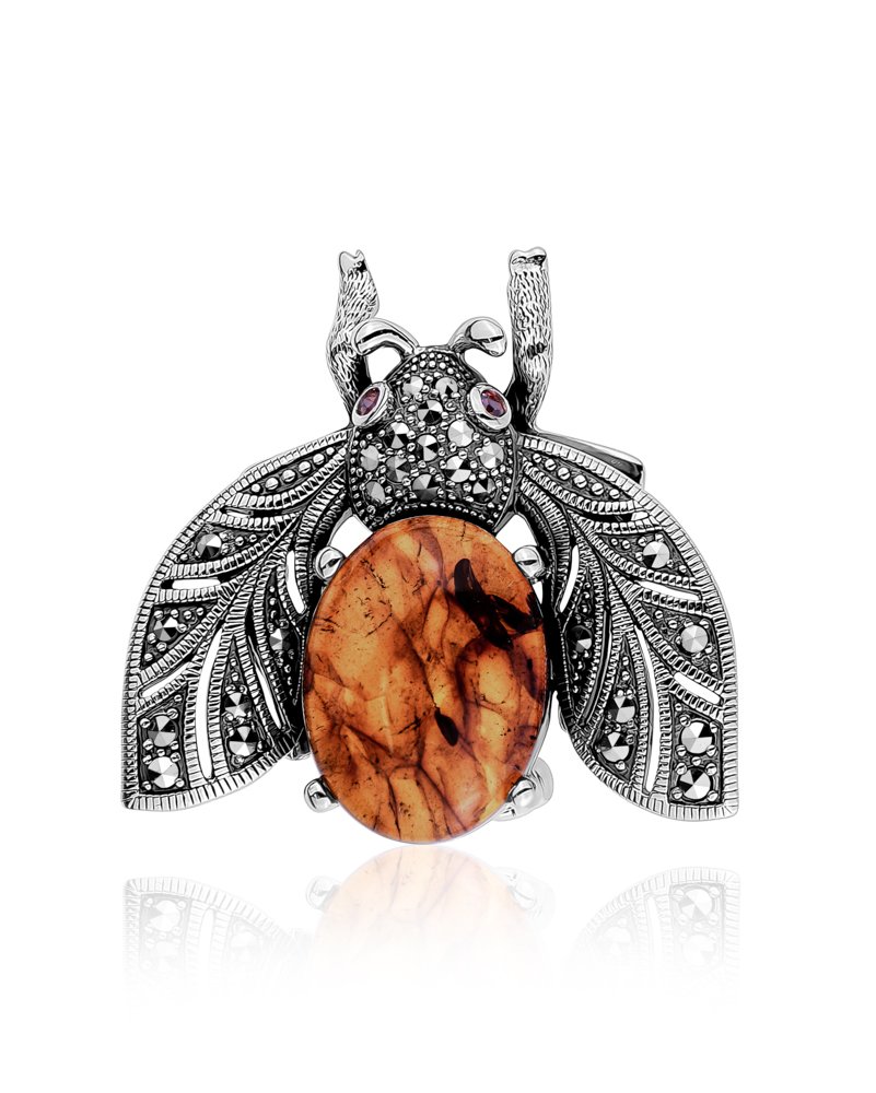 Broche en argent oxydé avec ambre comopressé cabochon, grenat et marcassites serties.