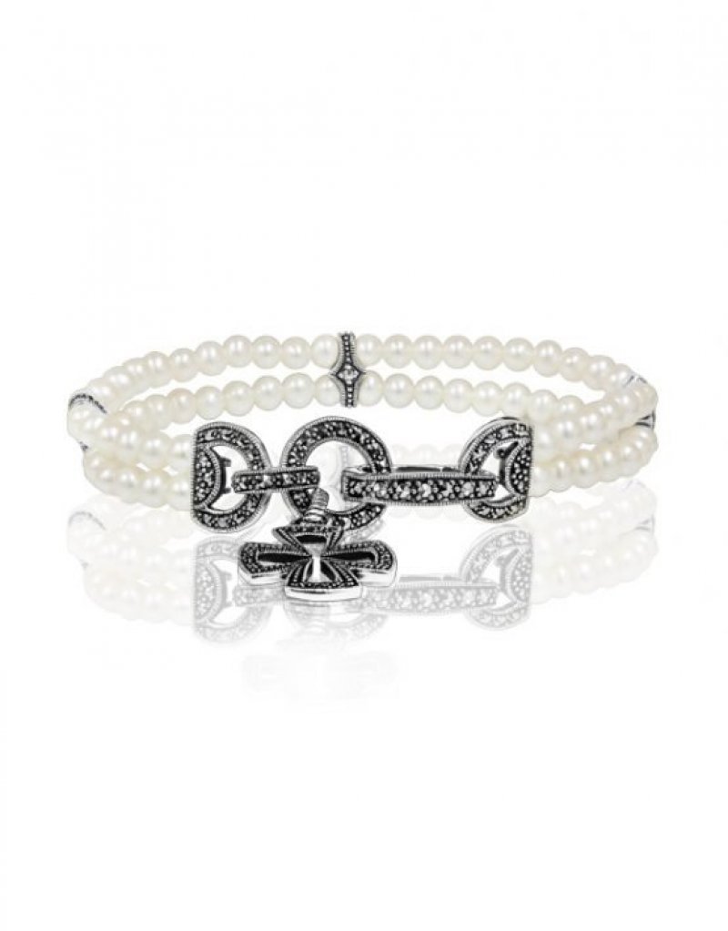 Bracelet croix et perles en argent oxydé avec perles d'eau douce et une breloque en croix-carré de marcassites serties.