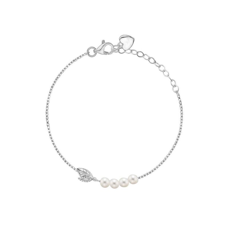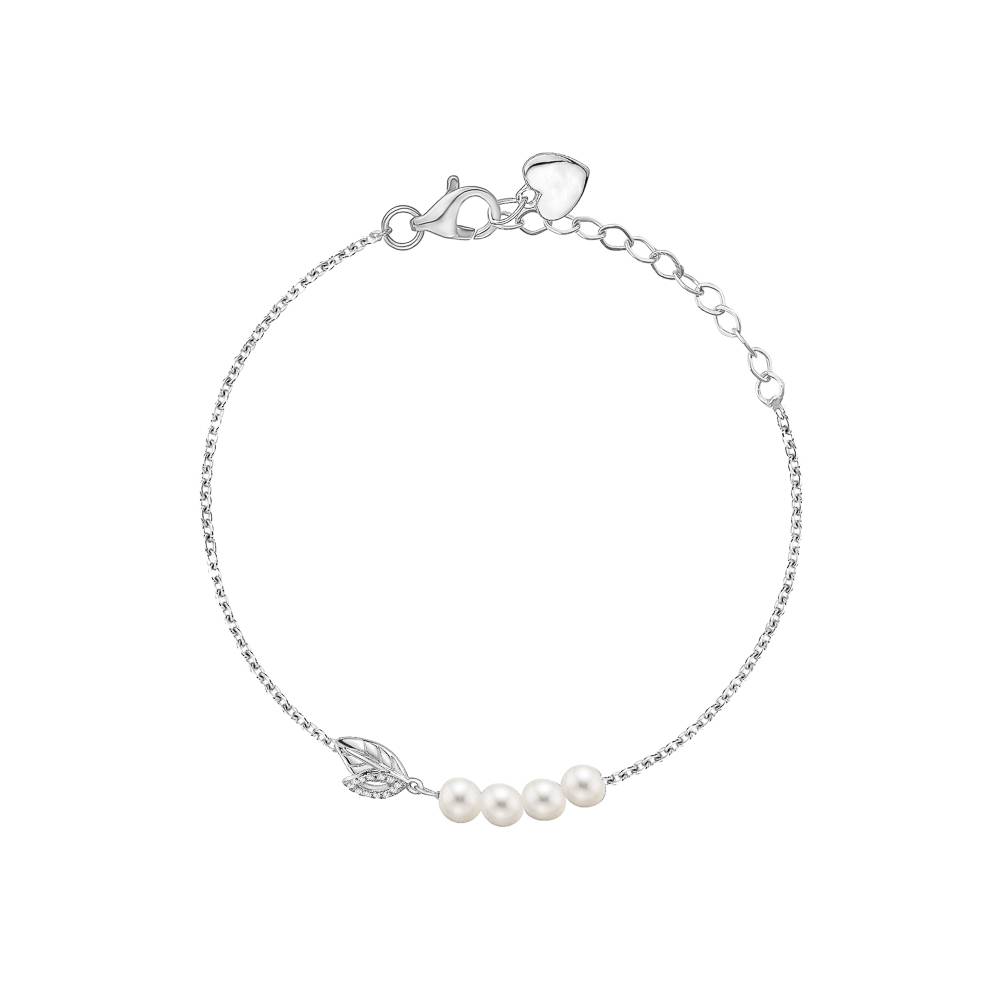Bracelet with 4 freshwater pearls and 2 silver leaves, one leaf outlined with cubic zirconia all on an adjustable sterling silver chain rhodium plated and platinum finished.