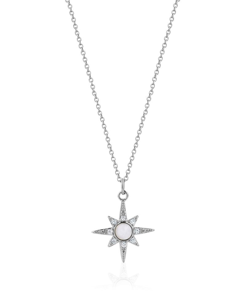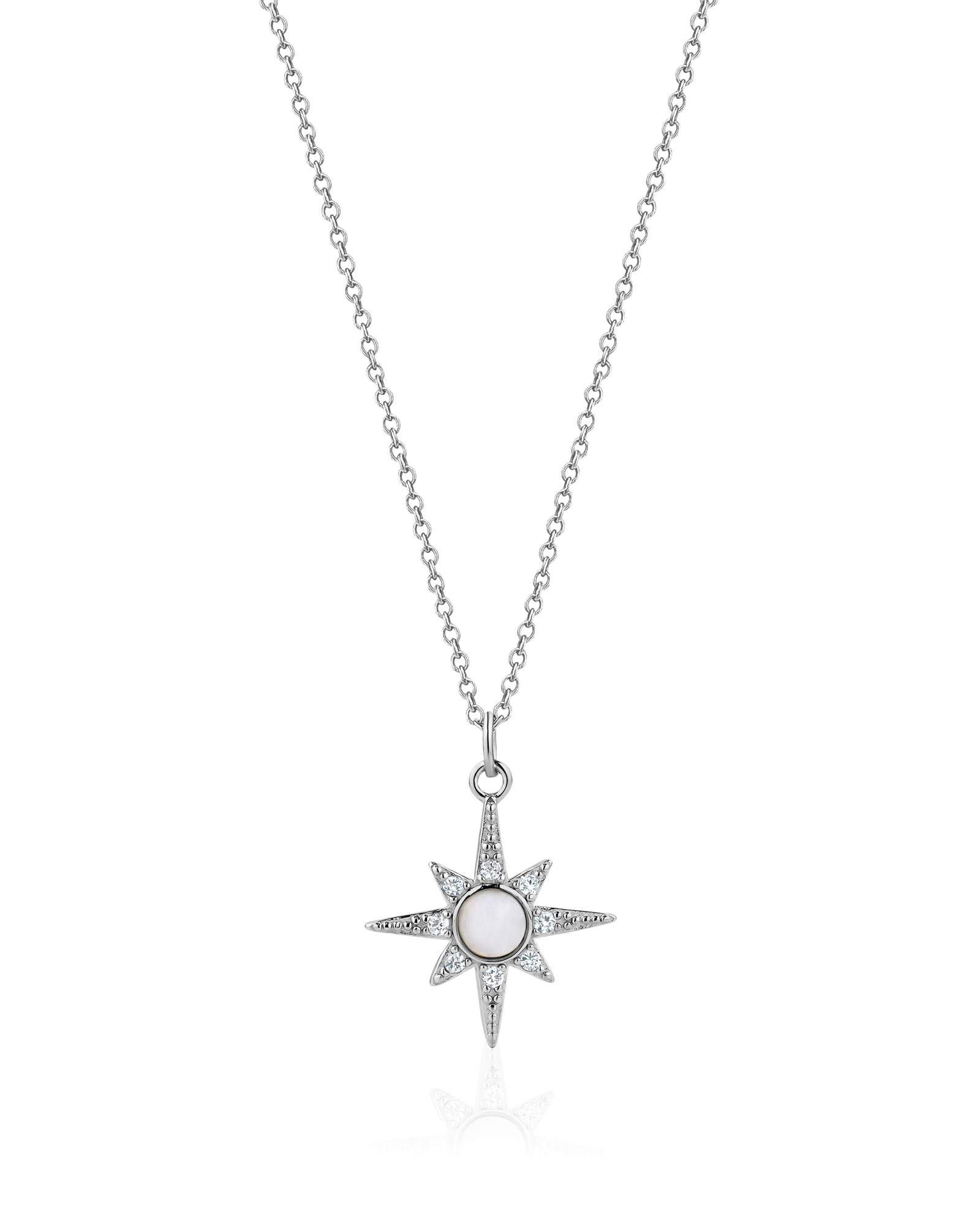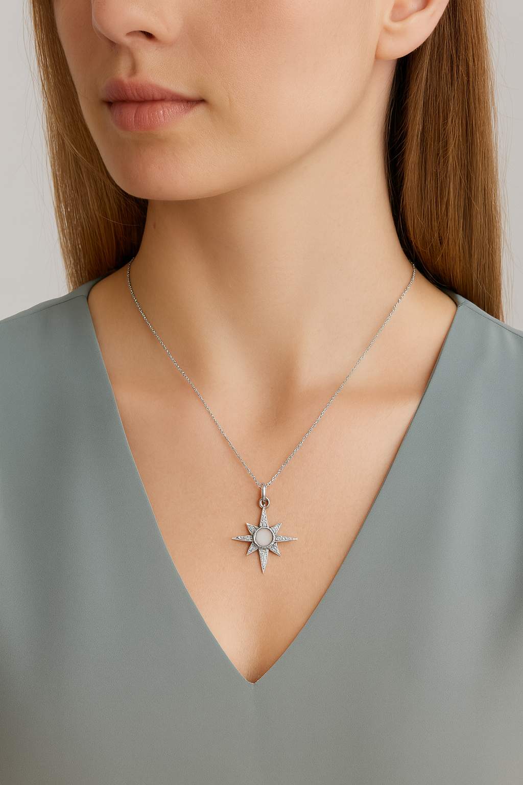 This timeless necklace is crafted in rhodium-plated sterling silver and features a round natural moonstone at its center. The moonstone’s soft, iridescent glow is beautifully framed with sparkling cubic zirconia, creating a perfect balance of elegance and modern design. Delicate yet eye-catching, this piece is versatile enough to wear every day or to elevate an evening look.