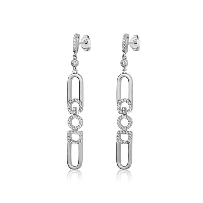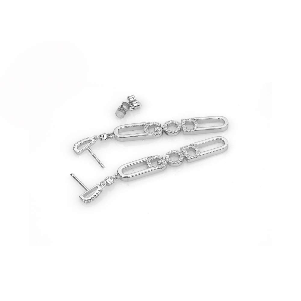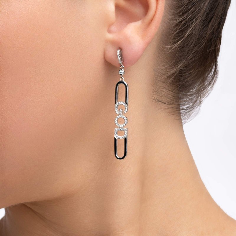 Discover the GOD pave letter earrings in rhodium-plated sterling silver. Modern sparkle, meaningful design, and shimmering cubic zirconia — a bold and elegant statement piece.