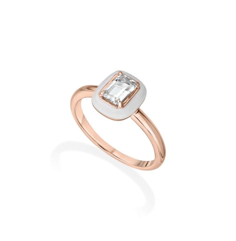 This elegant ring showcases an emerald-cut green mint quartz set within a smooth cushion of glossy white enamel. The warm rose-gold finish softens the cool tones of the stone, giving the piece a fresh yet timeless character.