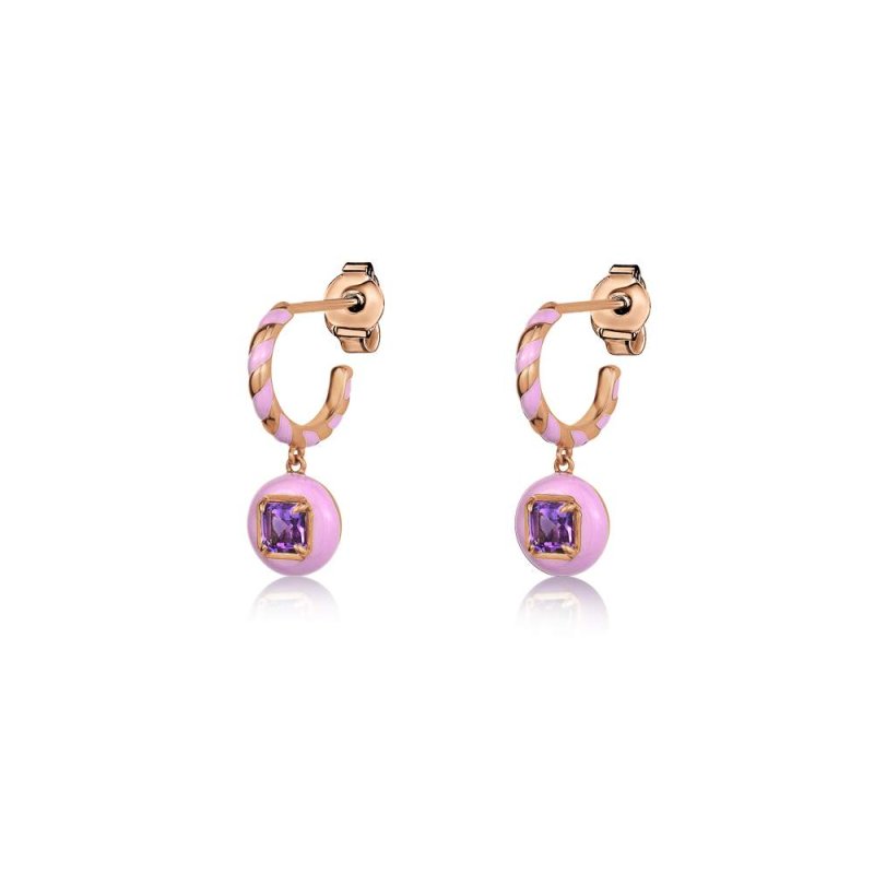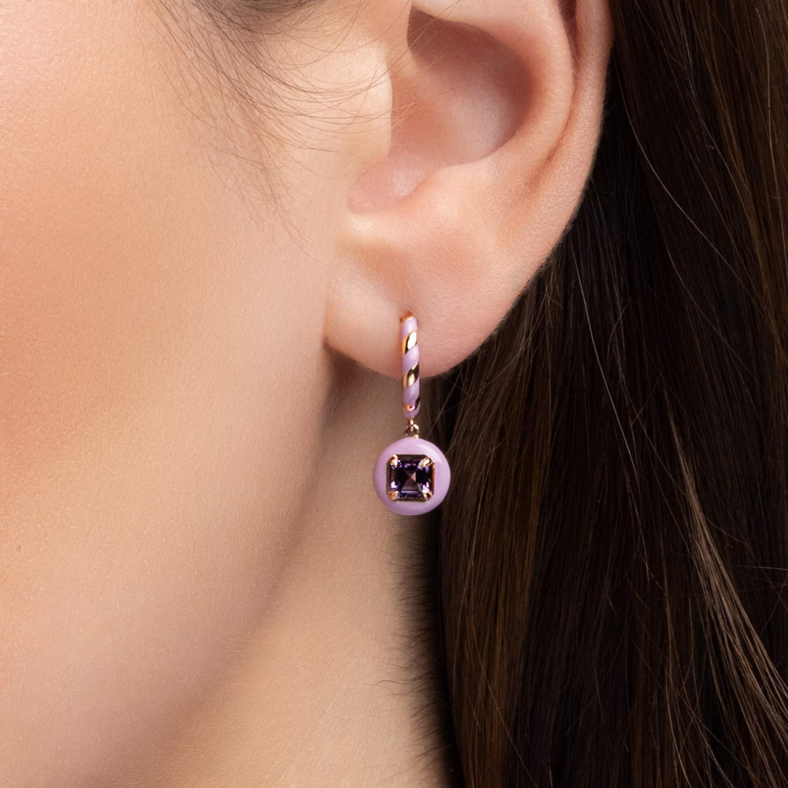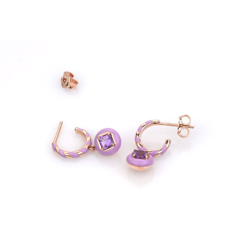 These playful drop earrings feature twisted hoops coated in soft lavender purple enamel, paired with dangling enamel orbs that frame a radiant amethyst at the center. The rose-gold finish adds warmth and harmony, highlighting the contrast between the pastel lavender enamel and the gemstone’s vivid violet tone.