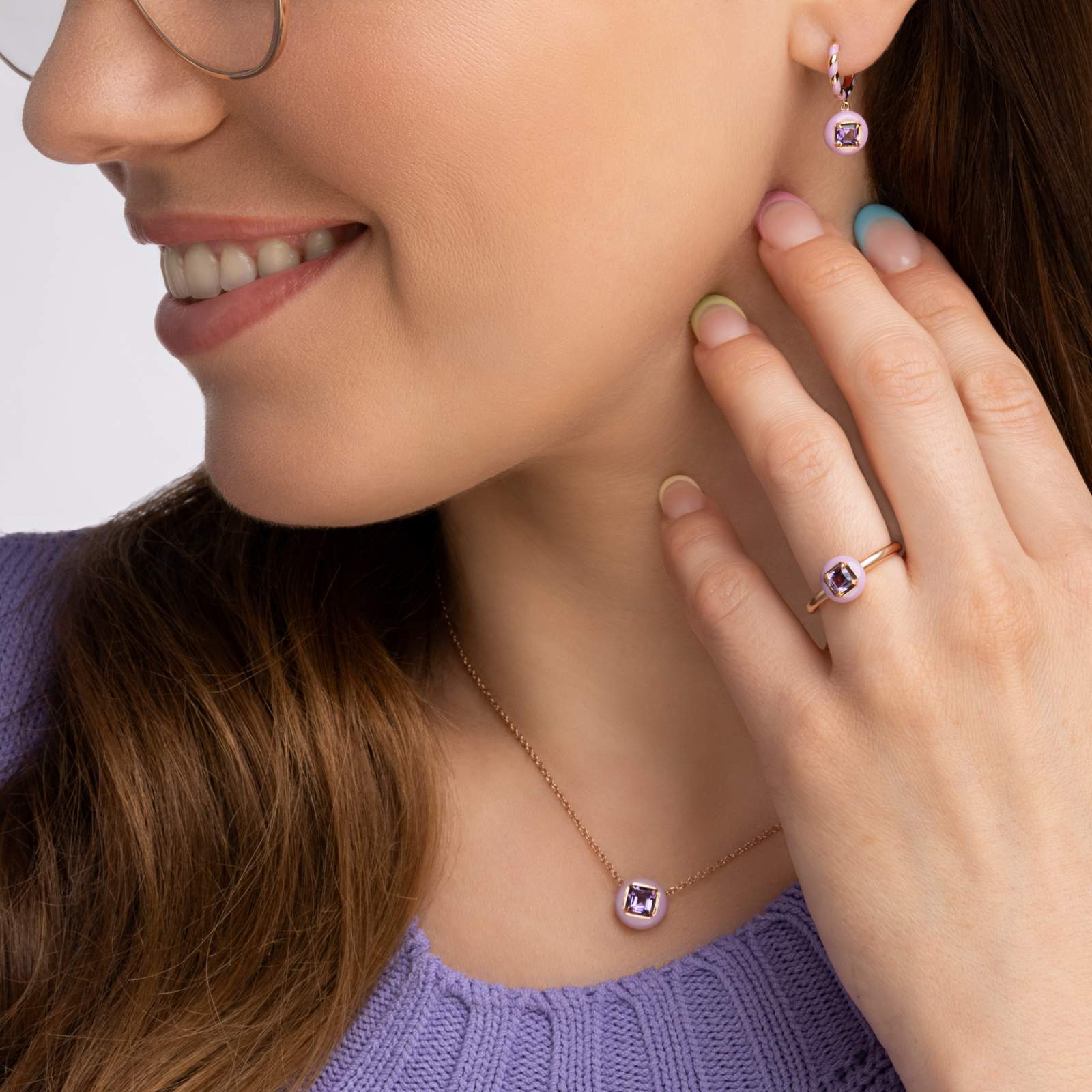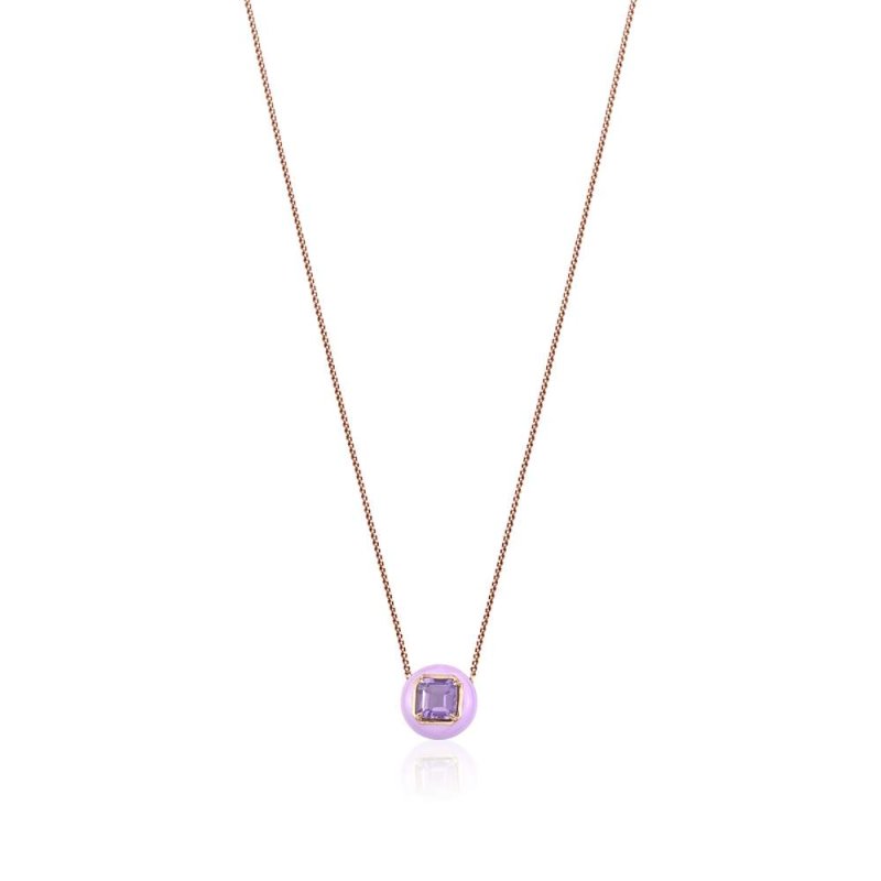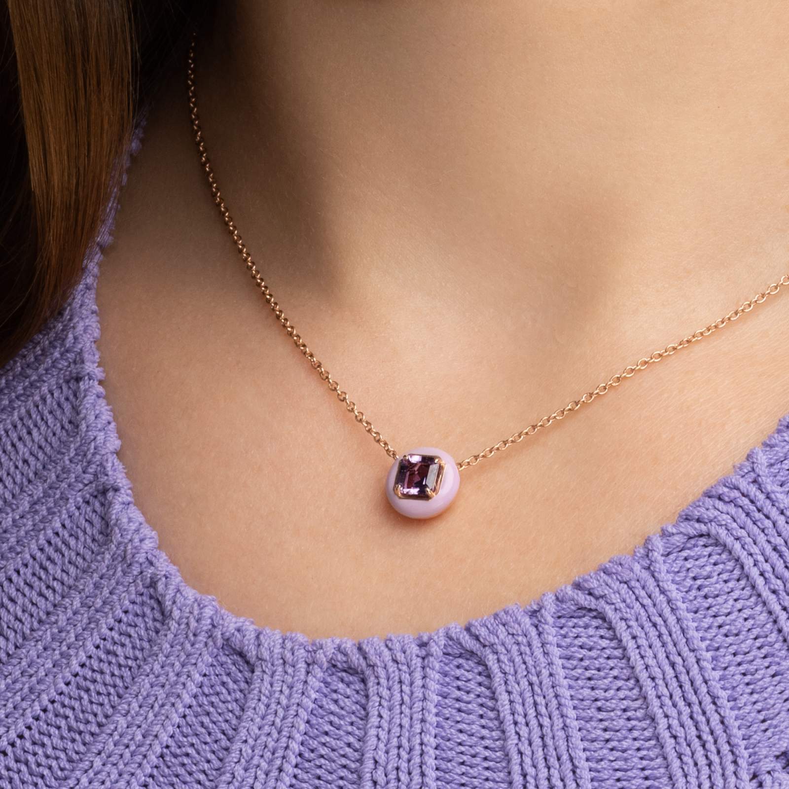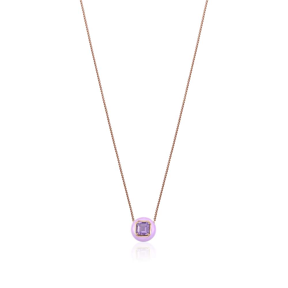 This elegant pendant features a round halo of smooth lavender purple enamel encircling a vibrant amethyst at the center. The rose-gold finish warms the design, creating a striking contrast between the soft pastel enamel and the gemstone’s rich violet tone.