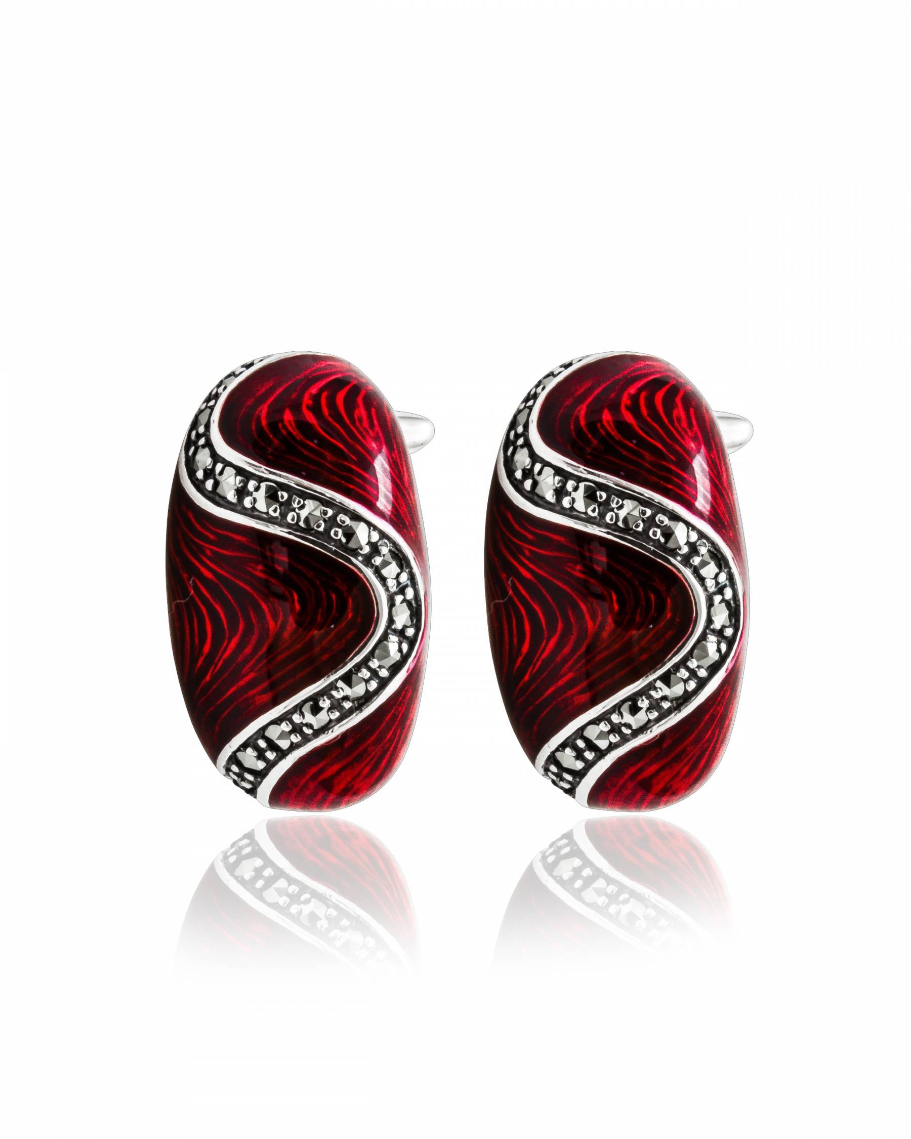 Oxidized silver earrings with red enamel and prong-set marcasite.