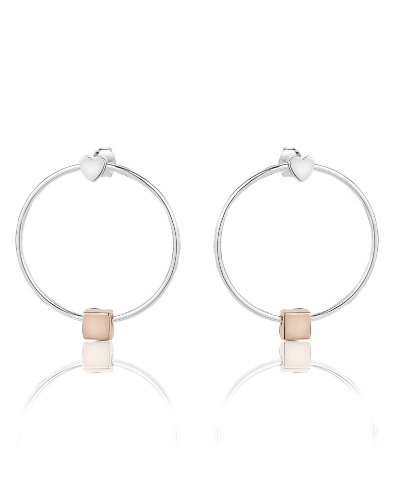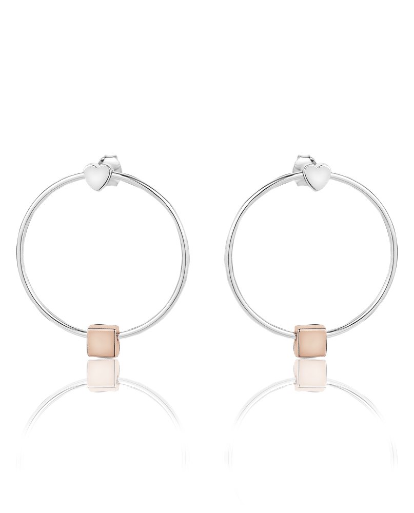 Rhodium plated silver earrings with heart stud and rose gold plated square charm.