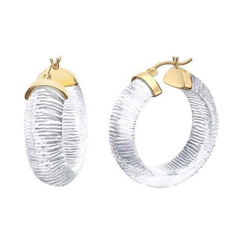 Lucite is a thermoplastic acrylic resin used as a substitute for glass. All earrings are set on gold plated silver.