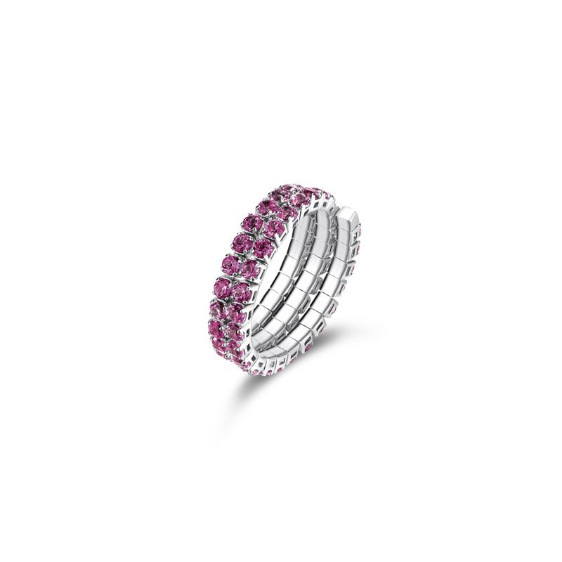 One size fits all rhodium plated silver coil ring with alexandrite coloured cubic zirconia for the month of June.