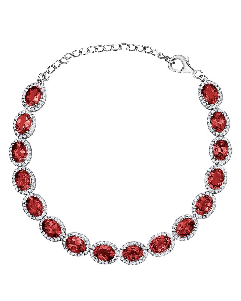 Rhodium plated silver bracelet adorned with rubies embellished with cubic zirconias.